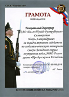 Командующий войсками СЗО ВВ МВД РФ генерал – лейтенант Львов А. Г. вручил генеральному директору компании Балт-Трейд Руструбпром Силиверстову И.А. грамоту за вклад и активное содействие по созданию воинского мемориала Северо-Западного округа внутренних войск МВД России храма "Преображения Господня". В ближайшее время в помещении Храма будет установлена мемориальная табличка с упоминанием компании.