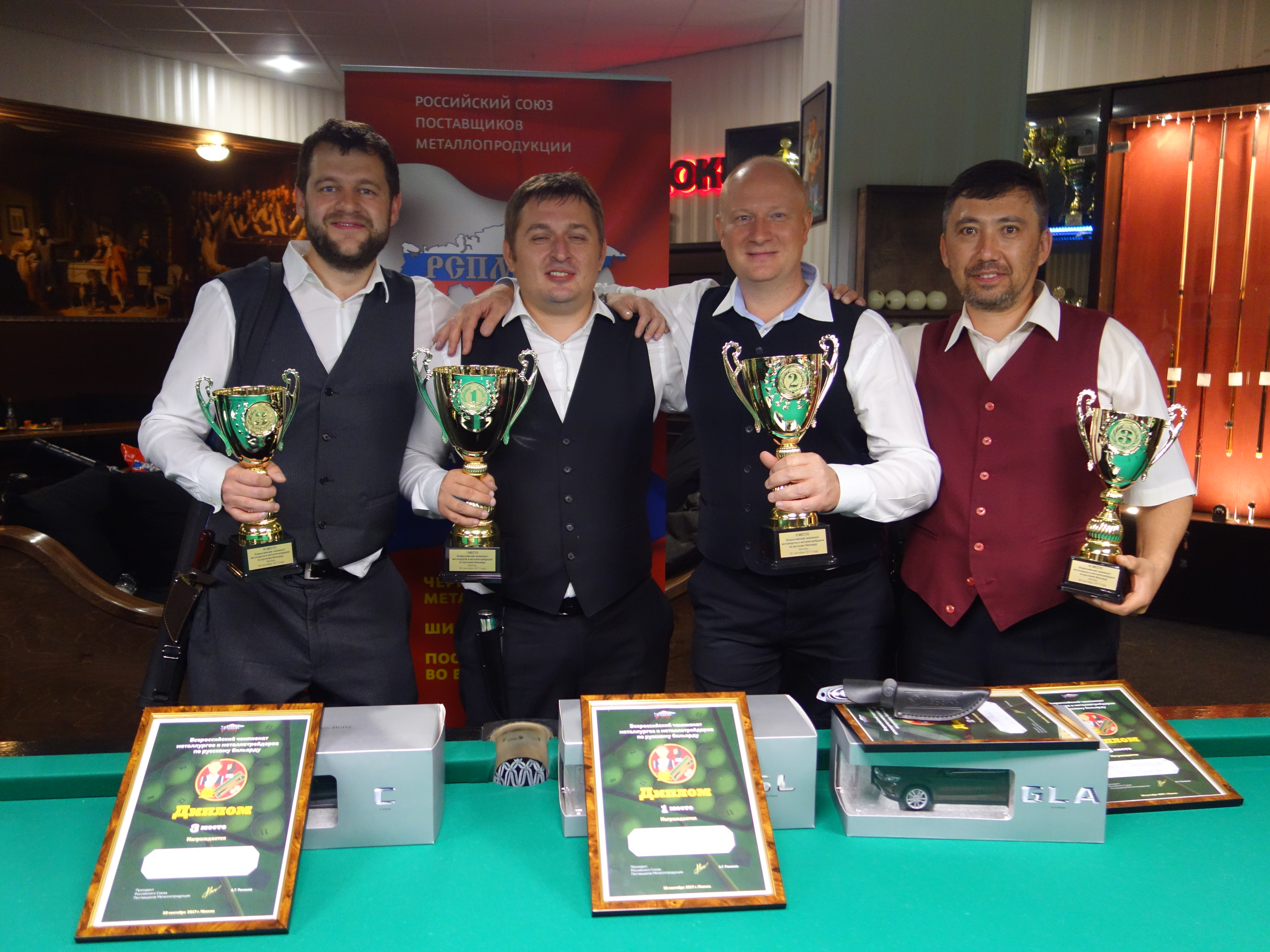 - Победители и призеры турнира были награждены Кубками от РСПМ, призами (фирменные охотничьи ножи высокого качества) от нового направления бизнеса компании Меркаби и оригинальными моделями автомобилей Мерседес-Бенц, который выставил официальный дилер - компания МБ Рязань. Остальные участники турнира получили свежий номер журнала Металлоснабжение и сбыт, хорошее настроение, заряд адреналина, новых друзей и партнеров.